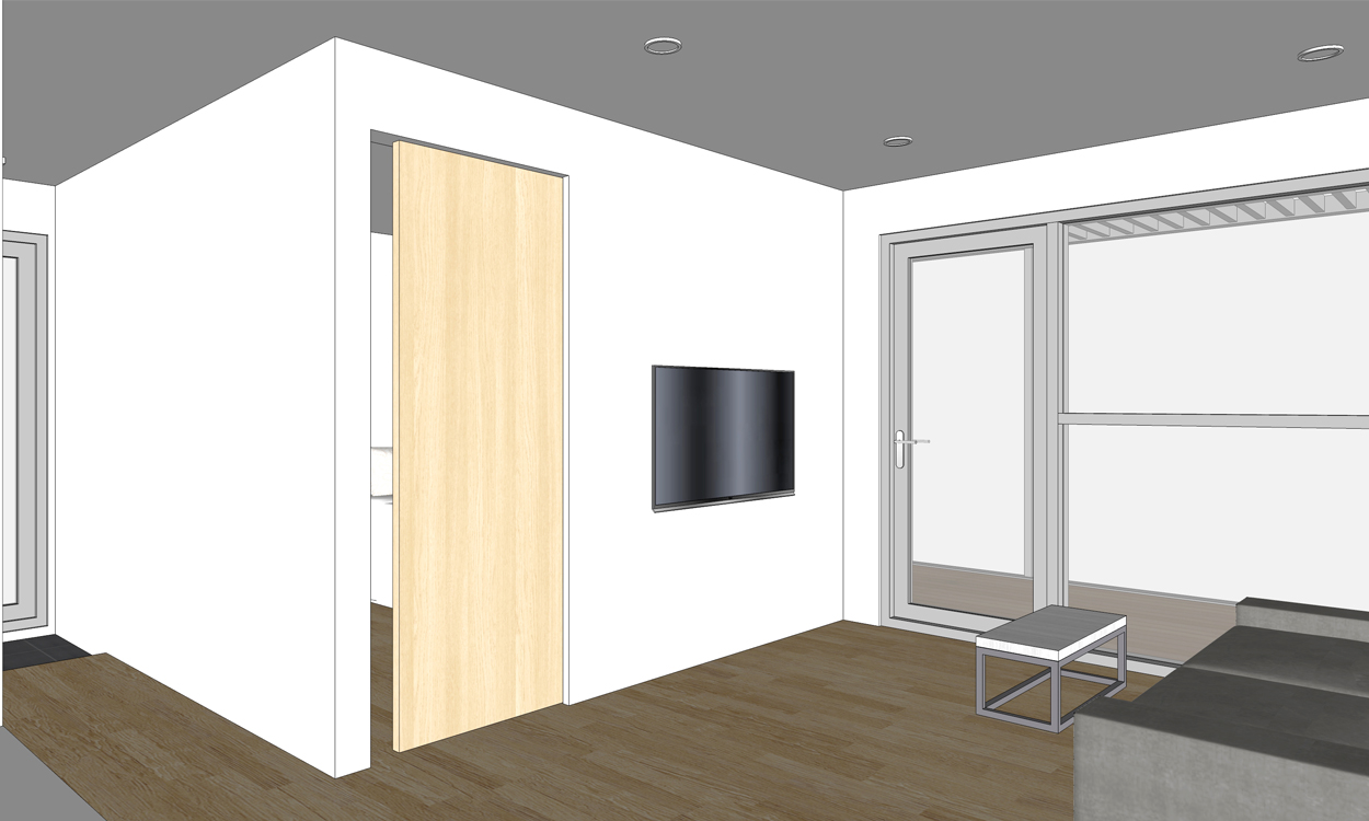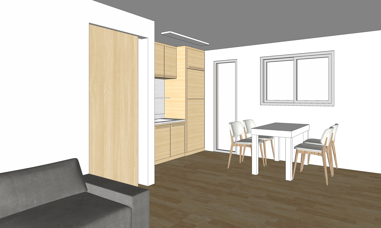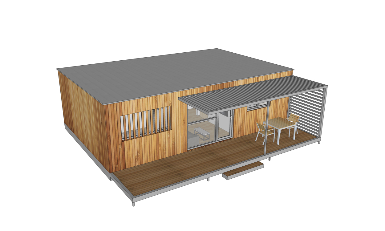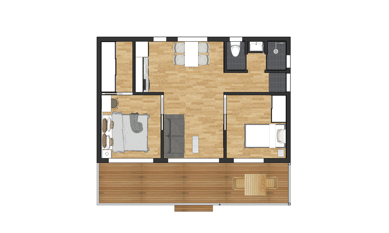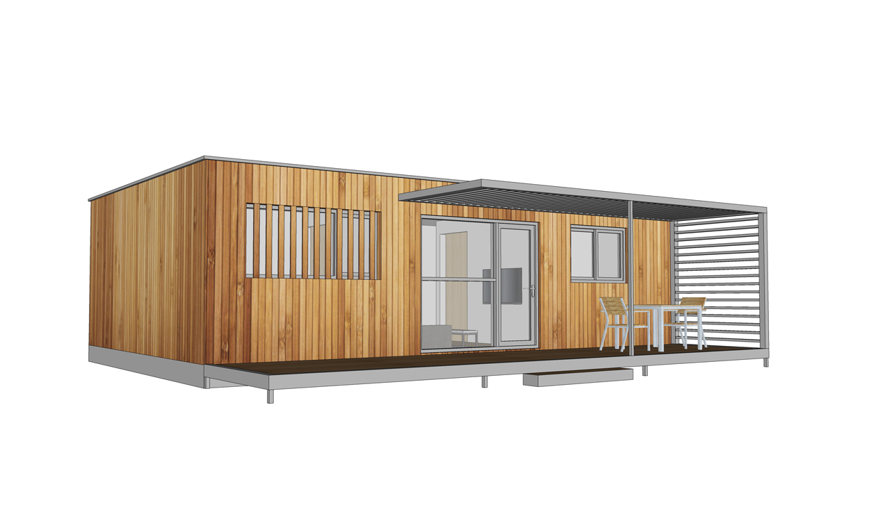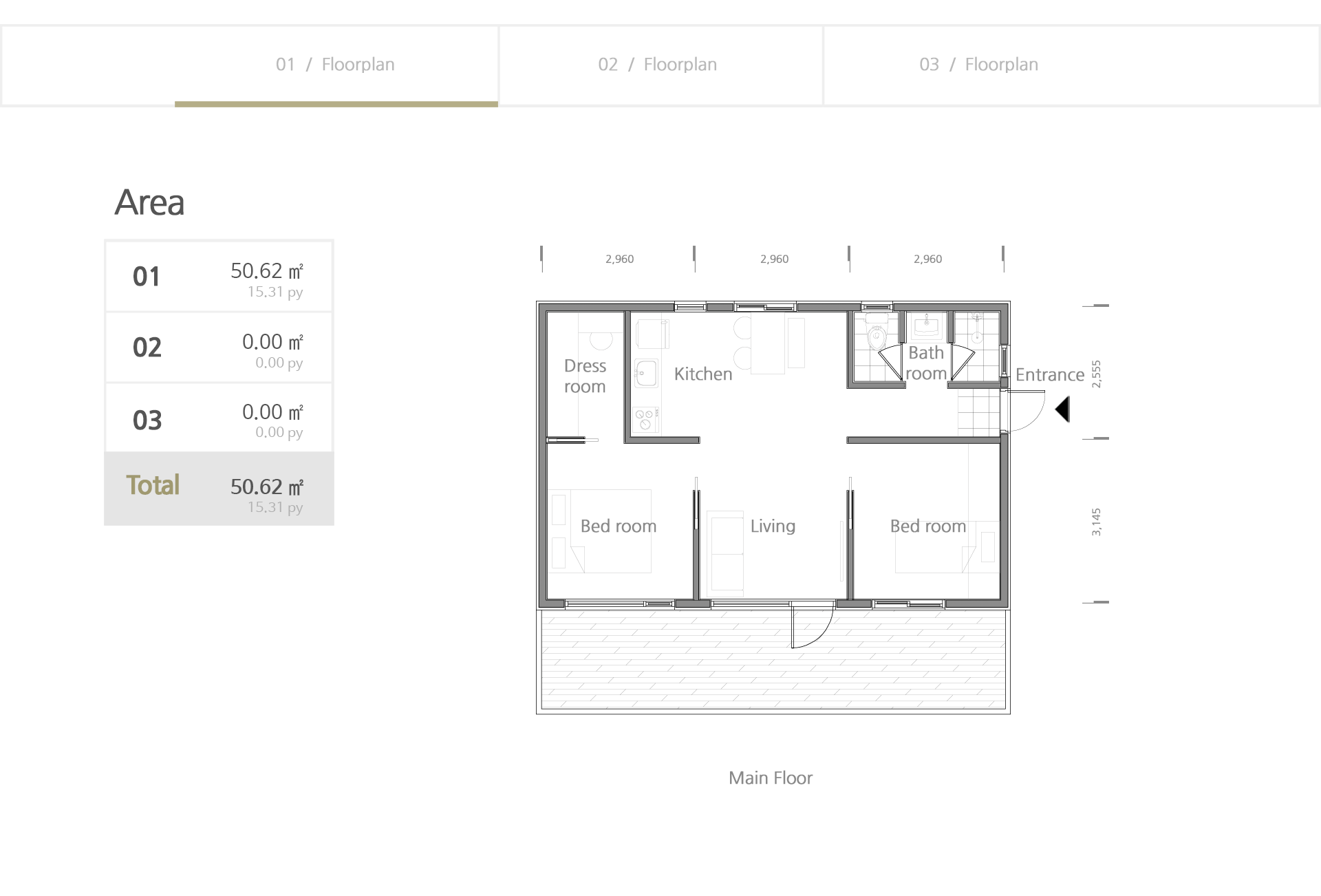 세개의 모듈박스가 연결되면서 변경되어 일체화시킨 타입으로 밝은 우드톤과 아이보리컬러의 마감으로 따뜻한 느낌으로 디자인된 주택.