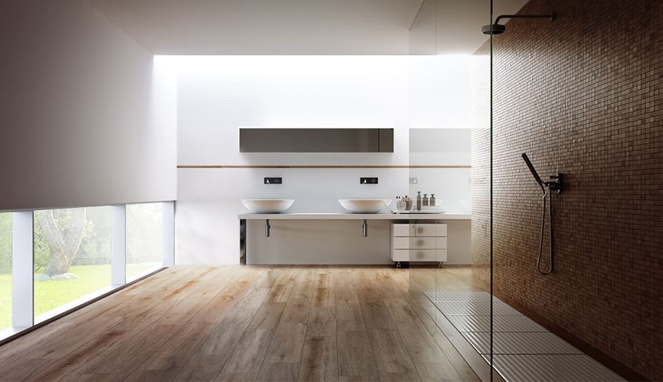 간결한 느낌이 물씬 풍기는 모던스타일의 욕실 인테리어는 생활하기 편리한 동선과 구조로 설계되었으며, 이동식 욕조나 필요한 가구를 이용할 수 있는 공간을 구성.