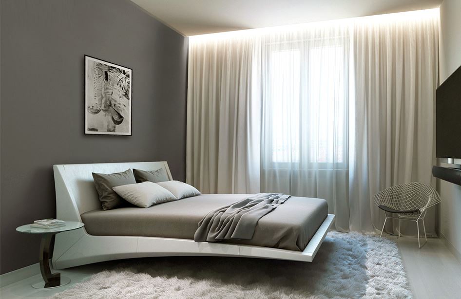 깨끗한 화이트 컬러로 공간을 더 넓어보이게 하고, 아늑한 브라운톤은 소품을 활용해 감각적이고 모던한 침실공간을 연출.